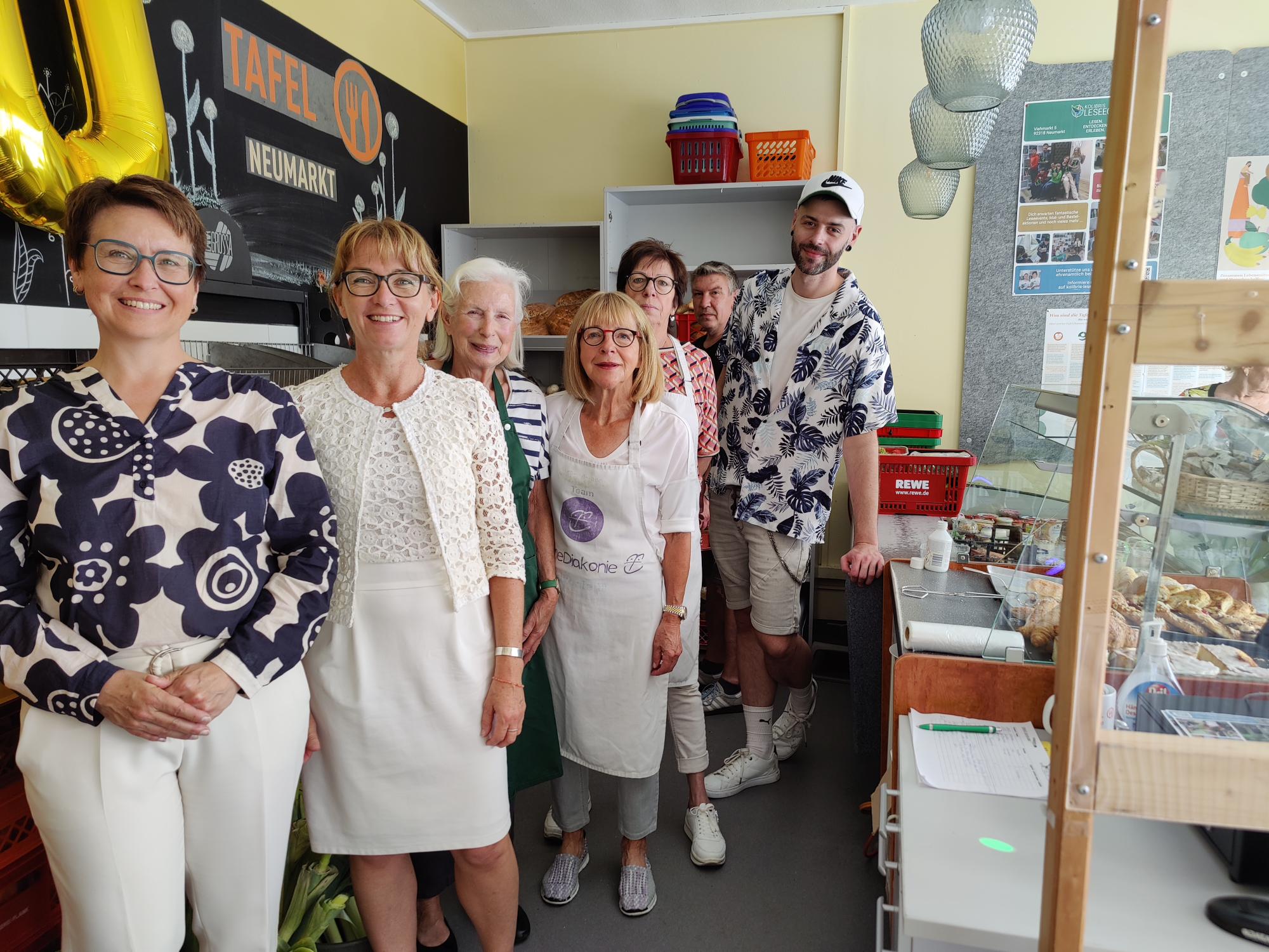 MdB Susanne Hierl nahm sich ausgiebig Zeit unsre Tafel anzuschauen und hörte mit großem Interesse den Informationen von Diakonie NAH e.V. Vorständin Dr. Elke Kaufmann und Projektkoordinator Thomas Torres Caraballo zu. Wichtig war ihr das Gespräch mit den Ehrenamtlichen, mit denen sie sich intensiv austauschte und unter anderem wissen wollte, woher die Sachspenden kommen, wie viele Menschen im Laden helfen und wie die Altersstruktur der Menschen ist, die den Leb-mit-Laden -Tafel besuchen. T. Torres Caraballo berichtete, dass mehr als 60 Ehrenamtliche mithelfen und viele junge Familien oder Teilfamilien, d.h. beispielsweise Oma und Enkelkind Kundinnen und Kunden sind. „Ungefähr 70 Tonnen Lebensmittel wurden von Januar bis Juni 2024 im Laden ausgegeben, das heißt sie wurden auch vor der Vernichtung bewahrt.“ Anlässlich des 20jährigen Jubiläums findet zurzeit eine Glücksradaktion statt mit sehr vielen Preisen, die die Junge Tafel Neumarkt (JUNO) gesammelt hat. „Es gibt keine Nieten und unsere Kundinnen und Kunden sind begeistert von dieser Aktion,“ freut sich T. Torres Caraballo. S.Hierl: „Es ist toll, was Sie in 20 Jahren aufgebaut haben und welche kreativen Angebote Sie immer wieder entwickeln! Ich wünsche Ihnen weiterhin viel Erfolg für Ihre wichtige Arbeit, die auch in Neumarkt notwendig ist.“ Im Bundestag will S. Hierl sich dafür stark machen, „dass keine Lebensmittel mehr weggeworfen werden müssen. Dazu wollen wir klarer zwischen Mindesthaltbarkeits- und Verbrauchsdatum unterscheiden. Wir wollen die kostenlose Weitergabe von Lebensmitteln an die Tafeln vereinfachen, indem wir z.B. die Haftungsregeln ändern, wenn abgelaufene Lebensmittel noch im Umlauf sind. Frankreich hat in diesem Bereich gute Vorschläge, die es lohnt, sich näher anzusehen.“ E. Kaufmann erläuterte, dass durch die Zusammenarbeit mit der Tafel Synergieeffekte entstanden. So kann im Laden die Tafel-Software zur Erfassung der gesammelten Lebensmittel kostenlos genutzt werden. Außerdem finden Weiterbildungen für das Team statt und durch das „Regionallager“ der Tafel Bayern in Feucht kann Unterstützung beispielsweise bei Lebensmittel-Engpässen gefunden werden. „Gerade Hygieneartikel wie Duschbad oder Zahnbürsten sind Mangelware. Hier sind wir dankbar für alle Sachspenden, die Bürgerinnen und Bürger vorbeibringen,“ so E. Kaufmann. Sie bedankte sich herzlich bei S. Hierl für ihren Besuch: „Vielen Dank für Ihr Interesse an unserer Arbeit. Wir bemühen uns hier im Leb-mit-Laden - Tafel pragmatische Angebote für die Menschen in Not zu machen. Die großen Lösungen müssen jedoch aus der Politik kommen. Deshalb ist Ihr Interesse so wertvoll!“