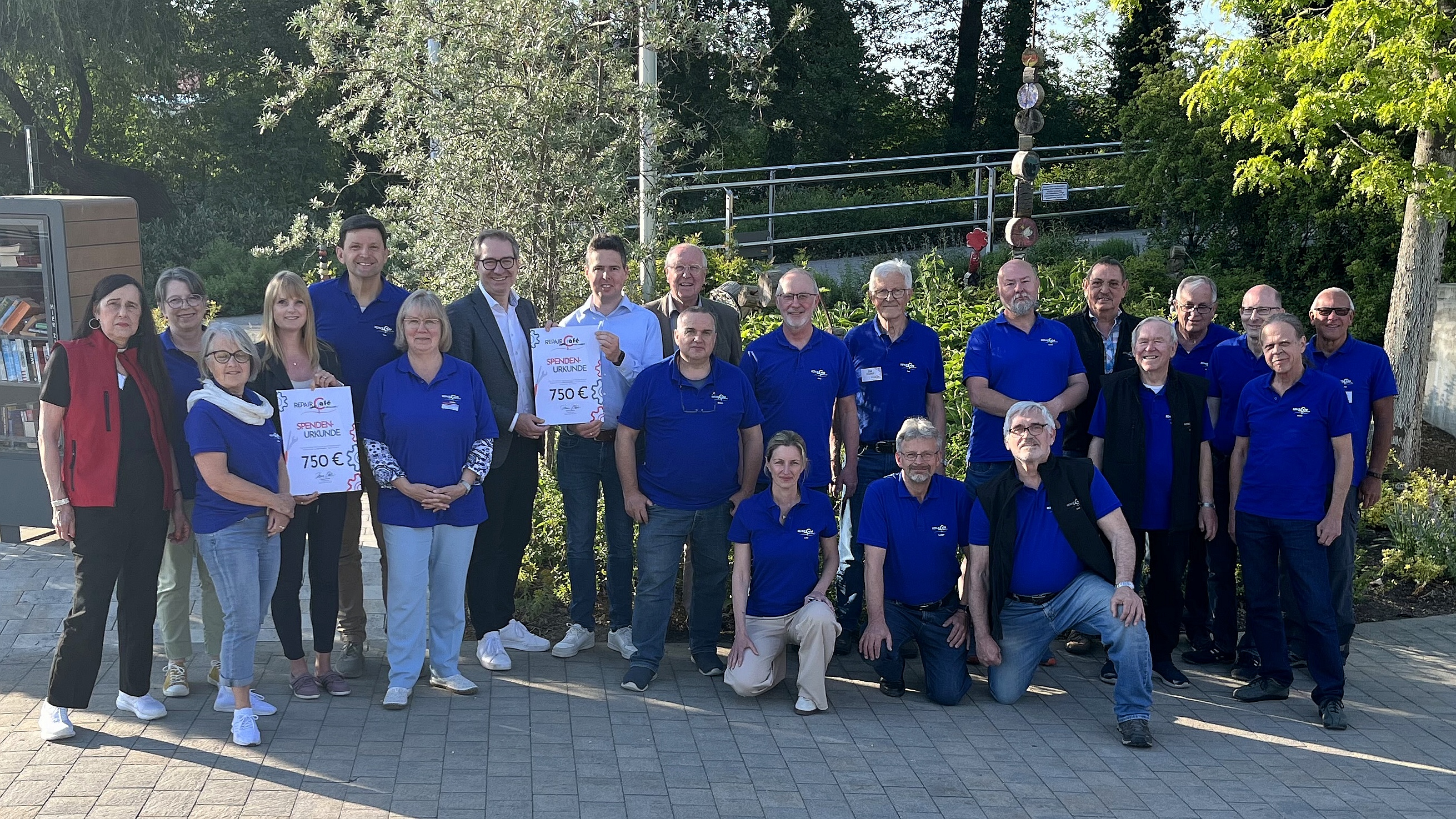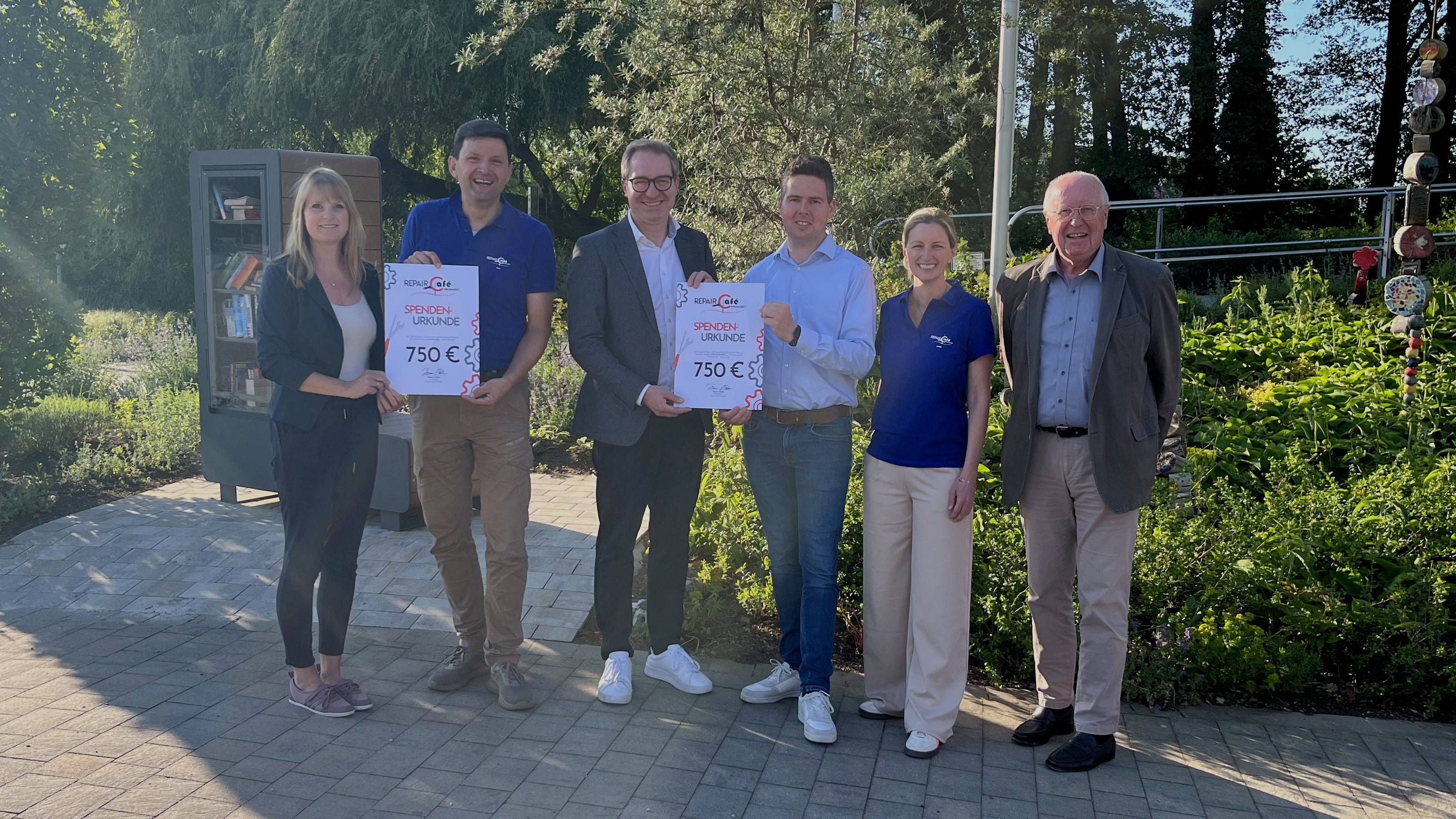 Große Freude herrschte kürzlich bei der Spendenübergabe des Repair Cafés Neumarkt. Zwei symbolische Schecks in Höhe von jeweils 750 Euro wurden überreicht, eine Spende ging an die Jura-Werkstätten der Lebenshilfe, die andere an die Tafel Neumarkt. Für die Lebenshilfe nahmen der Vorsitzende Dr. Wilhelm Baur und Produktionsleiter Christian Karl die Spende persönlich entgegen. Das Geld wird dort zur Schaffung neuer Begegnungs- und Ruhezonen im Innen- und Außenbereich der Werkstätten eingesetzt, ein wichtiger Beitrag zur Lebensqualität der Beschäftigten.